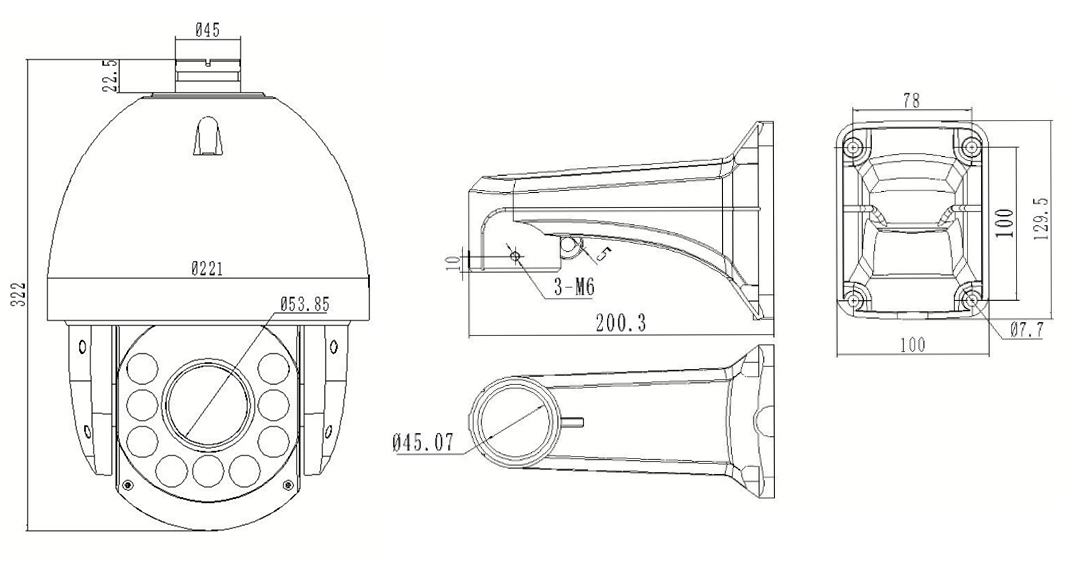 Camera noastră PTZ cântărește 6 kg, cu dimensiuni de φ221mm × 322mm, proiectată pentru o instalare ușoară.